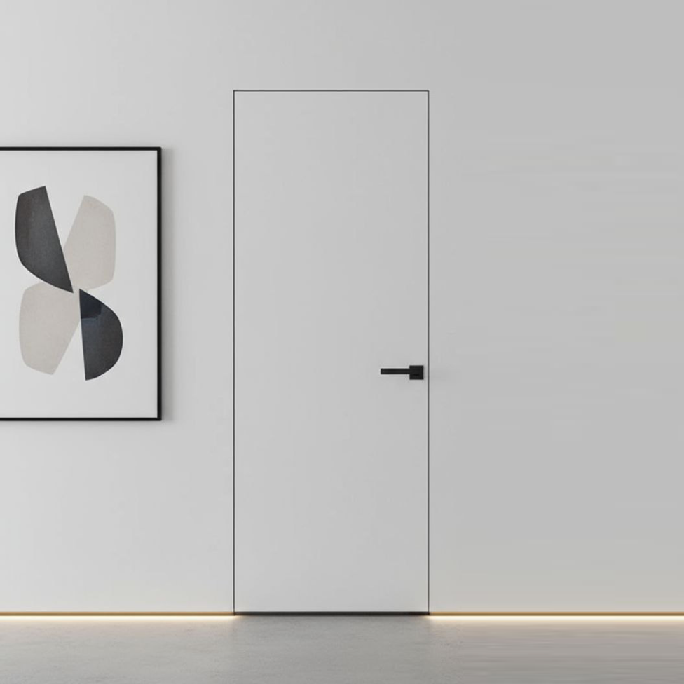 Скрытые двери под покраску. Модели из МДФ или массива с гладкой поверхностью, которые после установки окрашиваются в единый цвет со стенами. Это бюджетный и эстетичный способ добиться эффекта «невидимости».
